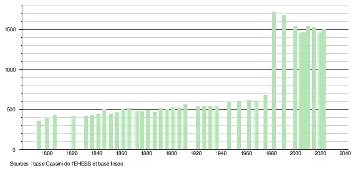 L'évolution du nombre d'habitants est connue à travers les recensements de la population effectués dans la commune depuis 1793. Pour les communes de moins de 10 000 habitants, une enquête de recensement portant sur toute la population est réalisée tous les cinq ans, les populations de référence des années intermédiaires étant quant à elles estimées par interpolation ou extrapolation[28]. Pour la commune, le premier recensement exhaustif entrant dans le cadre du nouveau dispositif a été réalisé en 2004[29].