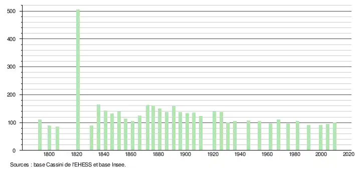 - ↑ Dans le tableau des recensements et le graphique, par convention dans Wikipédia, le principe a été retenu, pour les populations légales postérieures à 1999 de n’afficher dans le tableau des recensements et le graphique que les populations correspondant à l'année 2006, première population légale publiée calculée conformément aux concepts définis dans le décret no 2003-485 du 5 juin 2003, et les années correspondant à une enquête exhaustive de recensement pour les communes de moins de 10 000 habitants, ainsi que la dernière population légale publiée par l’Insee.