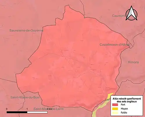 Le retrait-gonflement des sols argileux est susceptible d'engendrer des dommages importants aux bâtiments en cas d’alternance de périodes de sécheresse et de pluie. La totalité de la commune est en aléa moyen ou fort (67,4 % au niveau départemental et 48,5 % au niveau national). Sur les 104 bâtiments dénombrés sur la commune en 2019, 104 sont en aléa moyen ou fort, soit 100 %, à comparer aux 84 % au niveau départemental et 54 % au niveau national. Une cartographie de l'exposition du territoire national au retrait gonflement des sols argileux est disponible sur le site du BRGM[17],[Carte 2].