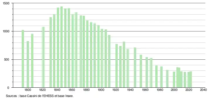 L'évolution du nombre d'habitants est connue à travers les recensements de la population effectués dans la commune depuis 1793. Pour les communes de moins de 10 000 habitants, une enquête de recensement portant sur toute la population est réalisée tous les cinq ans, les populations de référence des années intermédiaires étant quant à elles estimées par interpolation ou extrapolation[15]. Pour la commune, le premier recensement exhaustif entrant dans le cadre du nouveau dispositif a été réalisé en 2004[16].