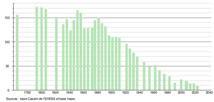 L'évolution du nombre d'habitants est connue à travers les recensements de la population effectués dans la commune depuis 1765. Pour les communes de moins de 10 000 habitants, une enquête de recensement portant sur toute la population est réalisée tous les cinq ans, les populations de référence des années intermédiaires étant quant à elles estimées par interpolation ou extrapolation[36]. Pour la commune, le premier recensement exhaustif entrant dans le cadre du nouveau dispositif a été réalisé en 2007[37].