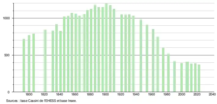 L'évolution du nombre d'habitants est connue à travers les recensements de la population effectués dans la commune depuis 1793. Pour les communes de moins de 10 000 habitants, une enquête de recensement portant sur toute la population est réalisée tous les cinq ans, les populations de référence des années intermédiaires étant quant à elles estimées par interpolation ou extrapolation[30]. Pour la commune, le premier recensement exhaustif entrant dans le cadre du nouveau dispositif a été réalisé en 2007[31].