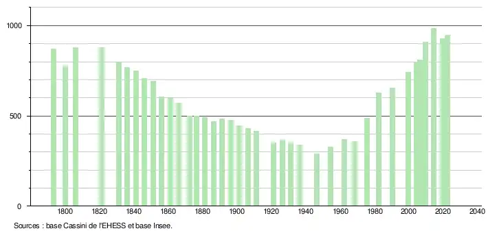 L'évolution du nombre d'habitants est connue à travers les recensements de la population effectués dans la commune depuis 1793. Pour les communes de moins de 10 000 habitants, une enquête de recensement portant sur toute la population est réalisée tous les cinq ans, les populations de référence des années intermédiaires étant quant à elles estimées par interpolation ou extrapolation[24]. Pour la commune, le premier recensement exhaustif entrant dans le cadre du nouveau dispositif a été réalisé en 2004[25].