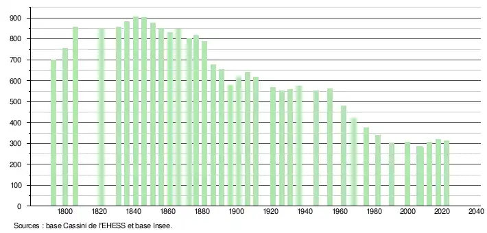 L'évolution du nombre d'habitants est connue à travers les recensements de la population effectués dans la commune depuis 1793. Pour les communes de moins de 10 000 habitants, une enquête de recensement portant sur toute la population est réalisée tous les cinq ans, les populations de référence des années intermédiaires étant quant à elles estimées par interpolation ou extrapolation[33]. Pour la commune, le premier recensement exhaustif entrant dans le cadre du nouveau dispositif a été réalisé en 2007[34].
