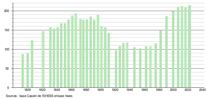 L'évolution du nombre d'habitants est connue à travers les recensements de la population effectués dans la commune depuis 1793. Pour les communes de moins de 10 000 habitants, une enquête de recensement portant sur toute la population est réalisée tous les cinq ans, les populations de référence des années intermédiaires étant quant à elles estimées par interpolation ou extrapolation[30]. Pour la commune, le premier recensement exhaustif entrant dans le cadre du nouveau dispositif a été réalisé en 2006[31].