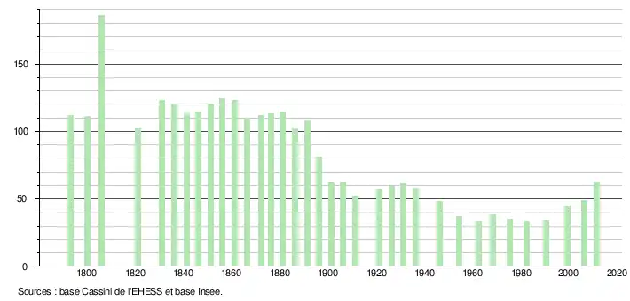 L'évolution du nombre d'habitants est connue à travers les recensements de la population effectués dans la commune depuis 1793. À partir du , les populations légales des communes sont publiées annuellement dans le cadre d'un recensement qui repose désormais sur une collecte d'information annuelle, concernant successivement tous les territoires communaux au cours d'une période de cinq ans. Pour les communes de moins de 10 000 habitants, une enquête de recensement portant sur toute la population est réalisée tous les cinq ans, les populations légales des années intermédiaires étant quant à elles estimées par interpolation ou extrapolation[5]. Pour la commune, le premier recensement exhaustif entrant dans le cadre du nouveau dispositif a été réalisé en 2006[6],[Note 1].