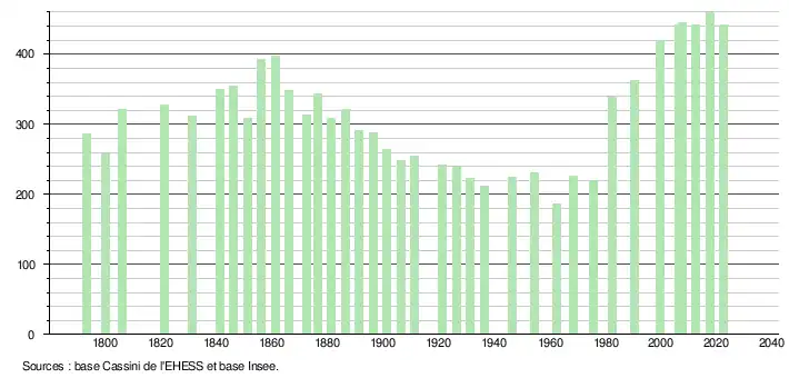 | L'évolution du nombre d'habitants est connue à travers les recensements de la population effectués dans la commune depuis 1793. Pour les communes de moins de 10 000 habitants, une enquête de recensement portant sur toute la population est réalisée tous les cinq ans, les populations de référence des années intermédiaires étant quant à elles estimées par interpolation ou extrapolation[21]. Pour la commune, le premier recensement exhaustif entrant dans le cadre du nouveau dispositif a été réalisé en 2007[22]. En 2022, la commune comptait 442 habitants[Note 4], en évolution de −2,64 % par rapport à 2016 (Gers : +1,04 %, France hors Mayotte : +2,11 %). |