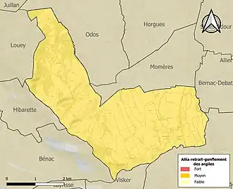 Le retrait-gonflement des sols argileux est susceptible d'engendrer des dommages importants aux bâtiments en cas d’alternance de périodes de sécheresse et de pluie. La totalité de la commune est en aléa moyen ou fort (44,5 % au niveau départemental et 48,5 % au niveau national). Sur les 177 bâtiments dénombrés sur la commune en 2019, 177 sont en aléa moyen ou fort, soit 100 %, à comparer aux 75 % au niveau départemental et 54 % au niveau national. Une cartographie de l'exposition du territoire national au retrait gonflement des sols argileux est disponible sur le site du BRGM[28],[Carte 3].