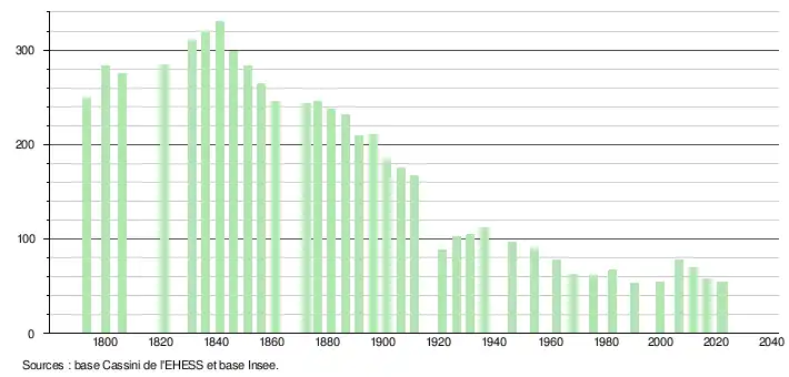 L'évolution du nombre d'habitants est connue à travers les recensements de la population effectués dans la commune depuis 1793. Pour les communes de moins de 10 000 habitants, une enquête de recensement portant sur toute la population est réalisée tous les cinq ans, les populations de référence des années intermédiaires étant quant à elles estimées par interpolation ou extrapolation[19]. Pour la commune, le premier recensement exhaustif entrant dans le cadre du nouveau dispositif a été réalisé en 2006[20].