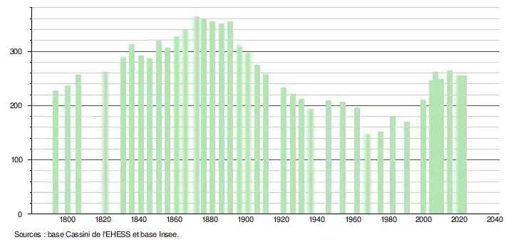 L'évolution du nombre d'habitants est connue à travers les recensements de la population effectués dans la commune depuis 1793. Pour les communes de moins de 10 000 habitants, une enquête de recensement portant sur toute la population est réalisée tous les cinq ans, les populations de référence des années intermédiaires étant quant à elles estimées par interpolation ou extrapolation[21]. Pour la commune, le premier recensement exhaustif entrant dans le cadre du nouveau dispositif a été réalisé en 2004[22].