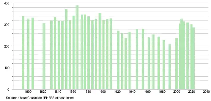 L'évolution du nombre d'habitants est connue à travers les recensements de la population effectués dans la commune depuis 1793. Pour les communes de moins de 10 000 habitants, une enquête de recensement portant sur toute la population est réalisée tous les cinq ans, les populations de référence des années intermédiaires étant quant à elles estimées par interpolation ou extrapolation[31]. Pour la commune, le premier recensement exhaustif entrant dans le cadre du nouveau dispositif a été réalisé en 2004[32].