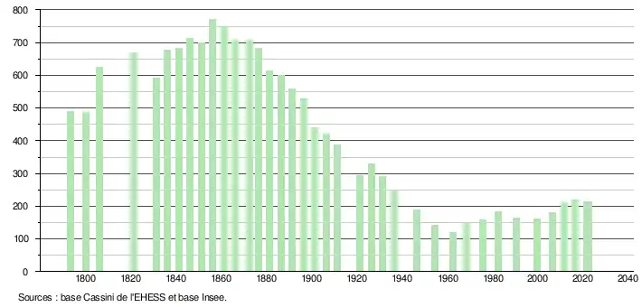 L'évolution du nombre d'habitants est connue à travers les recensements de la population effectués dans la commune depuis 1793. Pour les communes de moins de 10 000 habitants, une enquête de recensement portant sur toute la population est réalisée tous les cinq ans, les populations de référence des années intermédiaires étant quant à elles estimées par interpolation ou extrapolation[18]. Pour la commune, le premier recensement exhaustif entrant dans le cadre du nouveau dispositif a été réalisé en 2006[19].