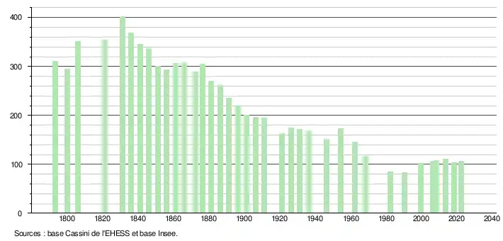 L'évolution du nombre d'habitants est connue à travers les recensements de la population effectués dans la commune depuis 1793. Pour les communes de moins de 10 000 habitants, une enquête de recensement portant sur toute la population est réalisée tous les cinq ans, les populations de référence des années intermédiaires étant quant à elles estimées par interpolation ou extrapolation[20]. Pour la commune, le premier recensement exhaustif entrant dans le cadre du nouveau dispositif a été réalisé en 2008[21].