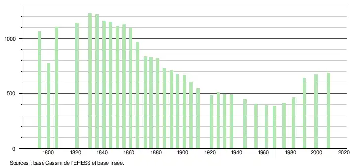 - ↑ Dans le tableau des recensements et le graphique, par convention dans Wikipédia, le principe a été retenu, pour les populations légales postérieures à 1999 de n’afficher dans le tableau des recensements et le graphique que les populations correspondant à l'année 2006, première population légale publiée calculée conformément aux concepts définis dans le décret no 2003-485 du 5 juin 2003, et les années correspondant à une enquête exhaustive de recensement pour les communes de moins de 10 000 habitants, ainsi que la dernière population légale publiée par l’Insee.