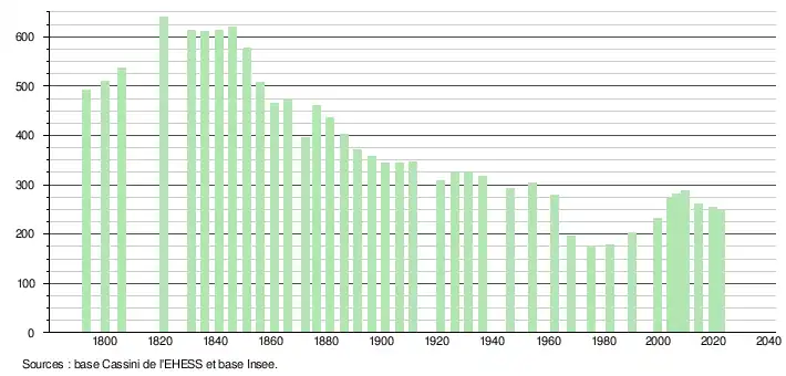 L'évolution du nombre d'habitants est connue à travers les recensements de la population effectués dans la commune depuis 1793. Pour les communes de moins de 10 000 habitants, une enquête de recensement portant sur toute la population est réalisée tous les cinq ans, les populations de référence des années intermédiaires étant quant à elles estimées par interpolation ou extrapolation[31]. Pour la commune, le premier recensement exhaustif entrant dans le cadre du nouveau dispositif a été réalisé en 2004[32].