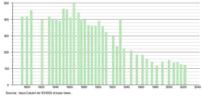 L'évolution du nombre d'habitants est connue à travers les recensements de la population effectués dans la commune depuis 1793. Pour les communes de moins de 10 000 habitants, une enquête de recensement portant sur toute la population est réalisée tous les cinq ans, les populations de référence des années intermédiaires étant quant à elles estimées par interpolation ou extrapolation[18]. Pour la commune, le premier recensement exhaustif entrant dans le cadre du nouveau dispositif a été réalisé en 2006[19].