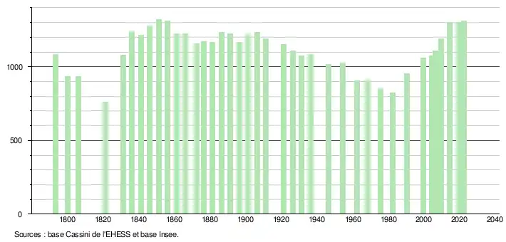 L'occupation des sols de la commune, telle qu'elle ressort de la base de données européenne d’occupation biophysique des sols Corine Land Cover (CLC), est marquée par l'importance des territoires agricoles (83,5 % en 2018), en diminution par rapport à 1990 (85,1 %). La répartition détaillée en 2018 est la suivante : terres arables (39,5 %), zones agricoles hétérogènes (37,4 %), forêts (13,7 %), prairies (6,6 %), zones urbanisées (1,9 %), mines, décharges et chantiers (0,9 %)[15]. L'évolution de l’occupation des sols de la commune et de ses infrastructures peut être observée sur les différentes représentations cartographiques du territoire : la carte de Cassini (XVIIIe siècle), la carte d'état-major (1820-1866) et les cartes ou photos aériennes de l'IGN pour la période actuelle (1950 à aujourd'hui)[Carte 1].