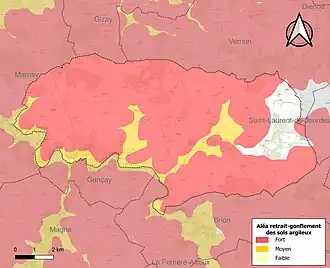 Les mouvements de terrains susceptibles de se produire sur la commune sont des tassements différentiels[19]. Le retrait-gonflement des sols argileux est susceptible d'engendrer des dommages importants aux bâtiments en cas d’alternance de périodes de sécheresse et de pluie[20]. 92,2 % de la superficie communale est en aléa moyen ou fort (79,5 % au niveau départemental et 48,5 % au niveau national)[Carte 2]. Depuis le , en application de la loi ÉLAN, différentes contraintes s'imposent aux vendeurs, maîtres d'ouvrages ou constructeurs de biens situés dans une zone classée en aléa moyen ou fort[Note 4],[21].