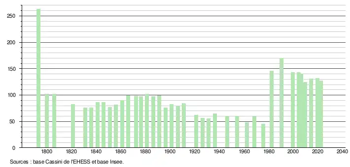 L'évolution du nombre d'habitants est connue à travers les recensements de la population effectués dans la commune depuis 1793. Pour les communes de moins de 10 000 habitants, une enquête de recensement portant sur toute la population est réalisée tous les cinq ans, les populations de référence des années intermédiaires étant quant à elles estimées par interpolation ou extrapolation[16]. Pour la commune, le premier recensement exhaustif entrant dans le cadre du nouveau dispositif a été réalisé en 2004[17].