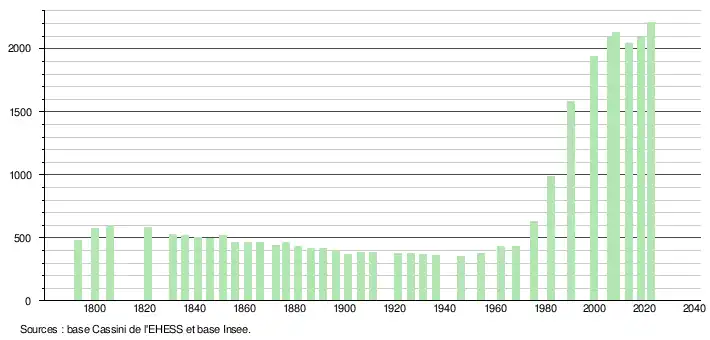 L'évolution du nombre d'habitants est connue à travers les recensements de la population effectués dans la commune depuis 1793. Pour les communes de moins de 10 000 habitants, une enquête de recensement portant sur toute la population est réalisée tous les cinq ans, les populations de référence des années intermédiaires étant quant à elles estimées par interpolation ou extrapolation[24]. Pour la commune, le premier recensement exhaustif entrant dans le cadre du nouveau dispositif a été réalisé en 2008[25].
