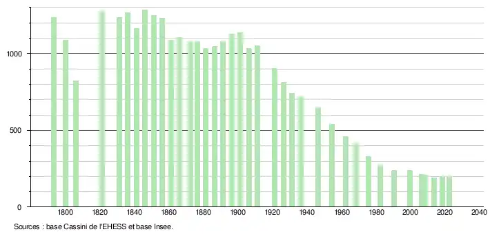 L'évolution du nombre d'habitants est connue à travers les recensements de la population effectués dans la commune depuis 1793. Pour les communes de moins de 10 000 habitants, une enquête de recensement portant sur toute la population est réalisée tous les cinq ans, les populations de référence des années intermédiaires étant quant à elles estimées par interpolation ou extrapolation[19]. Pour la commune, le premier recensement exhaustif entrant dans le cadre du nouveau dispositif a été réalisé en 2008[20].
