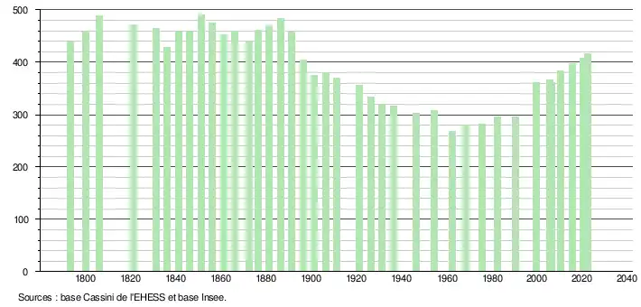 | L'évolution du nombre d'habitants est connue à travers les recensements de la population effectués dans la commune depuis 1793. Pour les communes de moins de 10 000 habitants, une enquête de recensement portant sur toute la population est réalisée tous les cinq ans, les populations de référence des années intermédiaires étant quant à elles estimées par interpolation ou extrapolation[31]. Pour la commune, le premier recensement exhaustif entrant dans le cadre du nouveau dispositif a été réalisé en 2005[32]. En 2022, la commune comptait 416 habitants[Note 5], en évolution de +3,74 % par rapport à 2016 (Lot : +1,31 %, France hors Mayotte : +2,11 %). |