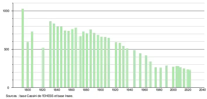 L'évolution du nombre d'habitants est connue à travers les recensements de la population effectués dans la commune depuis 1793. Pour les communes de moins de 10 000 habitants, une enquête de recensement portant sur toute la population est réalisée tous les cinq ans, les populations de référence des années intermédiaires étant quant à elles estimées par interpolation ou extrapolation[48]. Pour la commune, le premier recensement exhaustif entrant dans le cadre du nouveau dispositif a été réalisé en 2004[49].