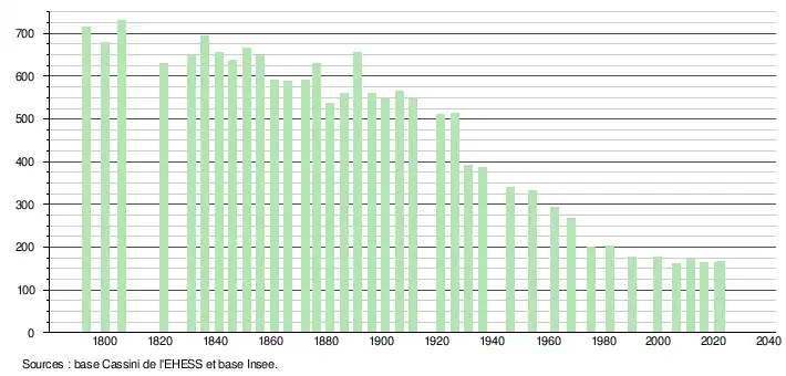 L'évolution du nombre d'habitants est connue à travers les recensements de la population effectués dans la commune depuis 1793. Pour les communes de moins de 10 000 habitants, une enquête de recensement portant sur toute la population est réalisée tous les cinq ans, les populations de référence des années intermédiaires étant quant à elles estimées par interpolation ou extrapolation[21]. Pour la commune, le premier recensement exhaustif entrant dans le cadre du nouveau dispositif a été réalisé en 2006[22].