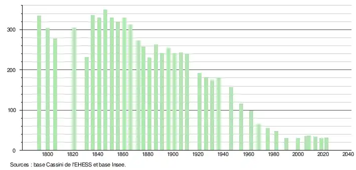 L'évolution du nombre d'habitants est connue à travers les recensements de la population effectués dans la commune depuis 1793. Pour les communes de moins de 10 000 habitants, une enquête de recensement portant sur toute la population est réalisée tous les cinq ans, les populations de référence des années intermédiaires étant quant à elles estimées par interpolation ou extrapolation[16]. Pour la commune, le premier recensement exhaustif entrant dans le cadre du nouveau dispositif a été réalisé en 2008[17].