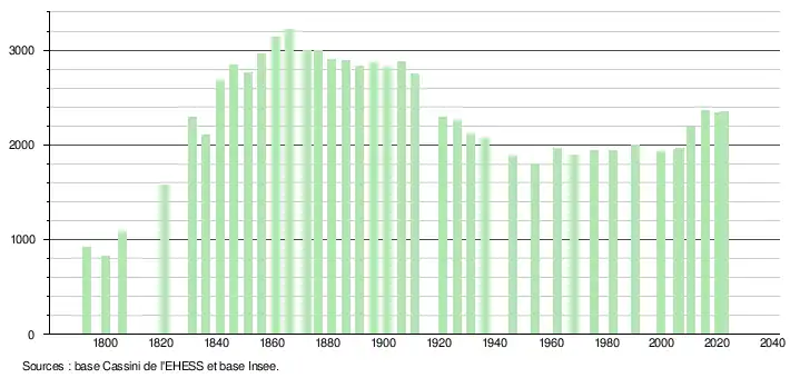 L'évolution du nombre d'habitants est connue à travers les recensements de la population effectués dans la commune depuis 1793. Pour les communes de moins de 10 000 habitants, une enquête de recensement portant sur toute la population est réalisée tous les cinq ans, les populations de référence des années intermédiaires étant quant à elles estimées par interpolation ou extrapolation[25]. Pour la commune, le premier recensement exhaustif entrant dans le cadre du nouveau dispositif a été réalisé en 2005[26].