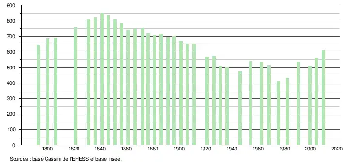 - ↑ Par convention dans Wikipédia, le principe a été retenu de n’afficher dans le tableau des recensements et le graphique, pour les populations légales postérieures à 1999, que les populations correspondant à une enquête exhaustive de recensement pour les communes de moins de 10 000 habitants, et que les populations des années 2006, 2011, 2016, etc. pour les communes de plus de 10 000 habitants, ainsi que la dernière population légale publiée par l’Insee pour l'ensemble des communes.
