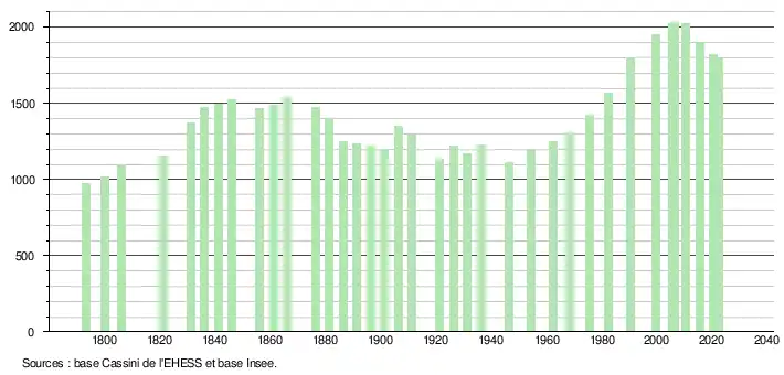 L'évolution du nombre d'habitants est connue à travers les recensements de la population effectués dans la commune depuis 1793. Pour les communes de moins de 10 000 habitants, une enquête de recensement portant sur toute la population est réalisée tous les cinq ans, les populations de référence des années intermédiaires étant quant à elles estimées par interpolation ou extrapolation[33]. Pour la commune, le premier recensement exhaustif entrant dans le cadre du nouveau dispositif a été réalisé en 2005[34].