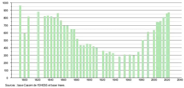 L'évolution du nombre d'habitants est connue à travers les recensements de la population effectués dans la commune depuis 1793. Pour les communes de moins de 10 000 habitants, une enquête de recensement portant sur toute la population est réalisée tous les cinq ans, les populations de référence des années intermédiaires étant quant à elles estimées par interpolation ou extrapolation[13]. Pour la commune, le premier recensement exhaustif entrant dans le cadre du nouveau dispositif a été réalisé en 2004[14].