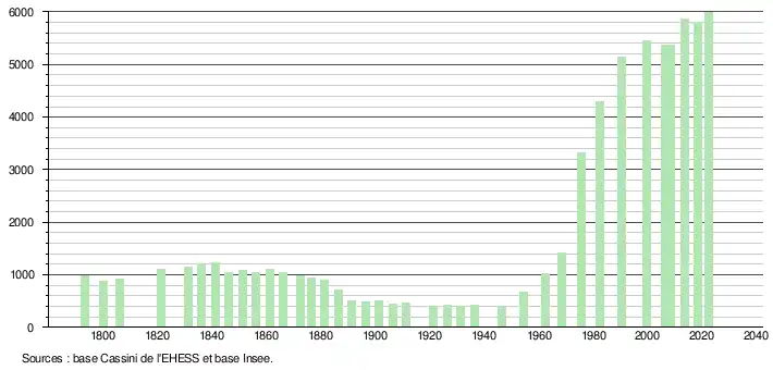L'évolution du nombre d'habitants est connue à travers les recensements de la population effectués dans la commune depuis 1793. Pour les communes de moins de 10 000 habitants, une enquête de recensement portant sur toute la population est réalisée tous les cinq ans, les populations de référence des années intermédiaires étant quant à elles estimées par interpolation ou extrapolation[22]. Pour la commune, le premier recensement exhaustif entrant dans le cadre du nouveau dispositif a été réalisé en 2008[23].