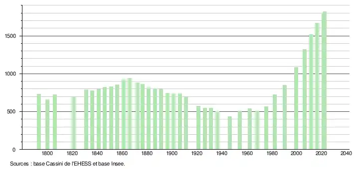 L'évolution du nombre d'habitants est connue à travers les recensements de la population effectués dans la commune depuis 1793. Pour les communes de moins de 10 000 habitants, une enquête de recensement portant sur toute la population est réalisée tous les cinq ans, les populations de référence des années intermédiaires étant quant à elles estimées par interpolation ou extrapolation[33]. Pour la commune, le premier recensement exhaustif entrant dans le cadre du nouveau dispositif a été réalisé en 2006[34].