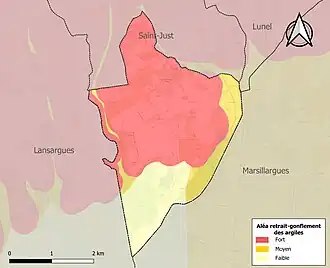 Le retrait-gonflement des sols argileux est susceptible d'engendrer des dommages importants aux bâtiments en cas d’alternance de périodes de sécheresse et de pluie. 80,6 % de la superficie communale est en aléa moyen ou fort (59,3 % au niveau départemental et 48,5 % au niveau national). Sur les 238 bâtiments dénombrés sur la commune en 2019, 237 sont en aléa moyen ou fort, soit 100 %, à comparer aux 85 % au niveau départemental et 54 % au niveau national. Une cartographie de l'exposition du territoire national au retrait gonflement des sols argileux est disponible sur le site du BRGM[27],[Carte 2].