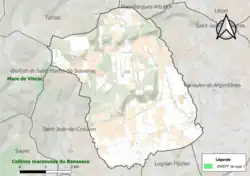 L'occupation des sols de la commune, telle qu'elle ressort de la base de données européenne d’occupation biophysique des sols Corine Land Cover (CLC), est marquée par l'importance des territoires agricoles (74,6 % en 2018), une proportion sensiblement équivalente à celle de 1990 (74,4 %). La répartition détaillée en 2018 est la suivante : cultures permanentes (45,6 %), zones agricoles hétérogènes (29 %), forêts (16,2 %), milieux à végétation arbustive et/ou herbacée (9,3 %)[9]. L'évolution de l’occupation des sols de la commune et de ses infrastructures peut être observée sur les différentes représentations cartographiques du territoire : la carte de Cassini (XVIIIe siècle), la carte d'état-major (1820-1866) et les cartes ou photos aériennes de l'IGN pour la période actuelle (1950 à aujourd'hui)[Carte 1].