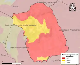 Le retrait-gonflement des sols argileux est susceptible d'engendrer des dommages importants aux bâtiments en cas d’alternance de périodes de sécheresse et de pluie. La totalité de la commune est en aléa moyen ou fort (67,5 % au niveau départemental et 48,5 % au niveau national). Sur les 40 bâtiments dénombrés sur la commune en 2019, 40 sont en aléa moyen ou fort, soit 100 %, à comparer aux 90 % au niveau départemental et 54 % au niveau national. Une cartographie de l'exposition du territoire national au retrait gonflement des sols argileux est disponible sur le site du BRGM[13],[Carte 2].