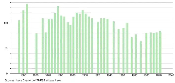 L'évolution du nombre d'habitants est connue à travers les recensements de la population effectués dans la commune depuis 1793. Pour les communes de moins de 10 000 habitants, une enquête de recensement portant sur toute la population est réalisée tous les cinq ans, les populations de référence des années intermédiaires étant quant à elles estimées par interpolation ou extrapolation[19]. Pour la commune, le premier recensement exhaustif entrant dans le cadre du nouveau dispositif a été réalisé en 2006[20].