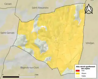 Le retrait-gonflement des sols argileux est susceptible d'engendrer des dommages importants aux bâtiments en cas d’alternance de périodes de sécheresse et de pluie. 81,9 % de la superficie communale est en aléa moyen ou fort (67,5 % au niveau départemental et 48,5 % au niveau national). Sur les 410 bâtiments dénombrés sur la commune en 2019, 391 sont en aléa moyen ou fort, soit 95 %, à comparer aux 90 % au niveau départemental et 54 % au niveau national. Une cartographie de l'exposition du territoire national au retrait gonflement des sols argileux est disponible sur le site du BRGM[13],[Carte 2].