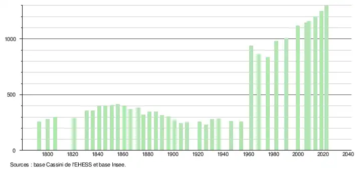 L'évolution du nombre d'habitants est connue à travers les recensements de la population effectués dans la commune depuis 1793. Pour les communes de moins de 10 000 habitants, une enquête de recensement portant sur toute la population est réalisée tous les cinq ans, les populations de référence des années intermédiaires étant quant à elles estimées par interpolation ou extrapolation[19]. Pour la commune, le premier recensement exhaustif entrant dans le cadre du nouveau dispositif a été réalisé en 2008[20].