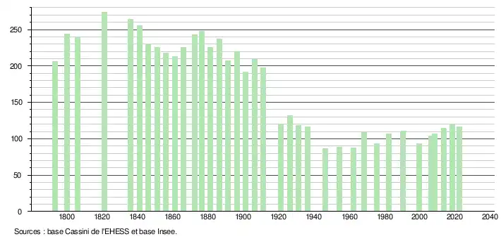L'évolution du nombre d'habitants est connue à travers les recensements de la population effectués dans la commune depuis 1793. Pour les communes de moins de 10 000 habitants, une enquête de recensement portant sur toute la population est réalisée tous les cinq ans, les populations de référence des années intermédiaires étant quant à elles estimées par interpolation ou extrapolation[27]. Pour la commune, le premier recensement exhaustif entrant dans le cadre du nouveau dispositif a été réalisé en 2008[28].
