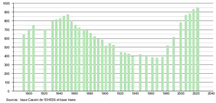 L'évolution du nombre d'habitants est connue à travers les recensements de la population effectués dans la commune depuis 1793. Pour les communes de moins de 10 000 habitants, une enquête de recensement portant sur toute la population est réalisée tous les cinq ans, les populations de référence des années intermédiaires étant quant à elles estimées par interpolation ou extrapolation[16]. Pour la commune, le premier recensement exhaustif entrant dans le cadre du nouveau dispositif a été réalisé en 2006[17].