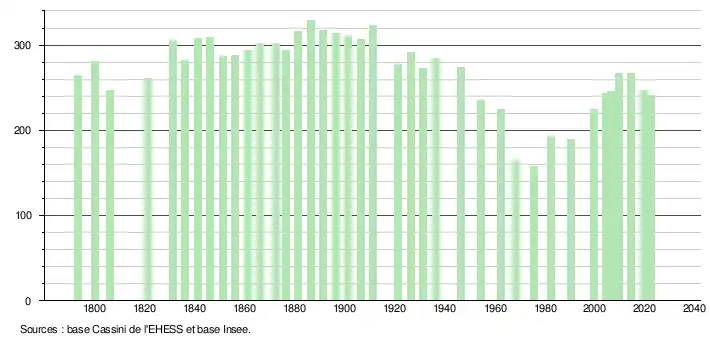 L'évolution du nombre d'habitants est connue à travers les recensements de la population effectués dans la commune depuis 1793. Pour les communes de moins de 10 000 habitants, une enquête de recensement portant sur toute la population est réalisée tous les cinq ans, les populations de référence des années intermédiaires étant quant à elles estimées par interpolation ou extrapolation[22]. Pour la commune, le premier recensement exhaustif entrant dans le cadre du nouveau dispositif a été réalisé en 2004[23].