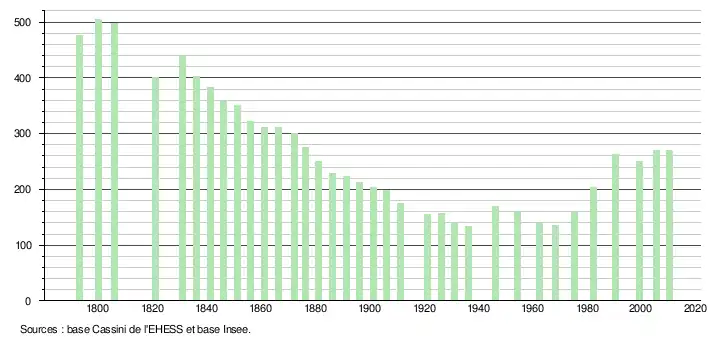 - ↑ Par convention dans Wikipédia, le principe a été retenu de n’afficher dans le tableau des recensements et le graphique, pour les populations légales postérieures à 1999, que les populations correspondant à une enquête exhaustive de recensement pour les communes de moins de 10 000 habitants, et que les populations des années 2006, 2011, 2016, etc. pour les communes de plus de 10 000 habitants, ainsi que la dernière population légale publiée par l’Insee pour l'ensemble des communes.