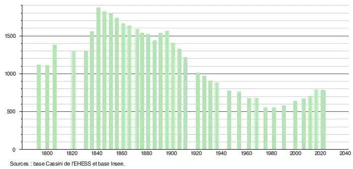 L'évolution du nombre d'habitants est connue à travers les recensements de la population effectués dans la commune depuis 1793. Pour les communes de moins de 10 000 habitants, une enquête de recensement portant sur toute la population est réalisée tous les cinq ans, les populations de référence des années intermédiaires étant quant à elles estimées par interpolation ou extrapolation[14]. Pour la commune, le premier recensement exhaustif entrant dans le cadre du nouveau dispositif a été réalisé en 2006[15].