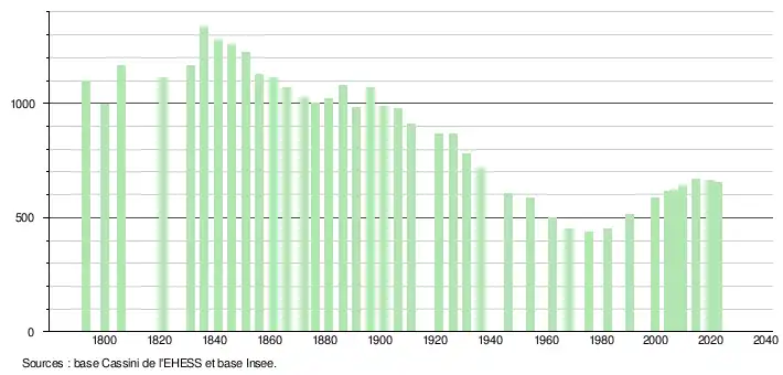 L'évolution du nombre d'habitants est connue à travers les recensements de la population effectués dans la commune depuis 1793. Pour les communes de moins de 10 000 habitants, une enquête de recensement portant sur toute la population est réalisée tous les cinq ans, les populations de référence des années intermédiaires étant quant à elles estimées par interpolation ou extrapolation[18]. Pour la commune, le premier recensement exhaustif entrant dans le cadre du nouveau dispositif a été réalisé en 2004[19].