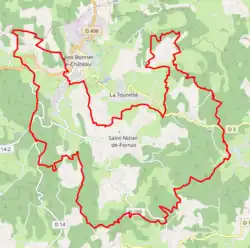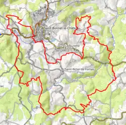 - ↑ © les contributeurs d’OpenStreetMap, « Distance par la route entre Saint-Nizier-de-Fornas et Saint-Bonnet-le-Château », sur le site OpenStreetMap (consulté le ).