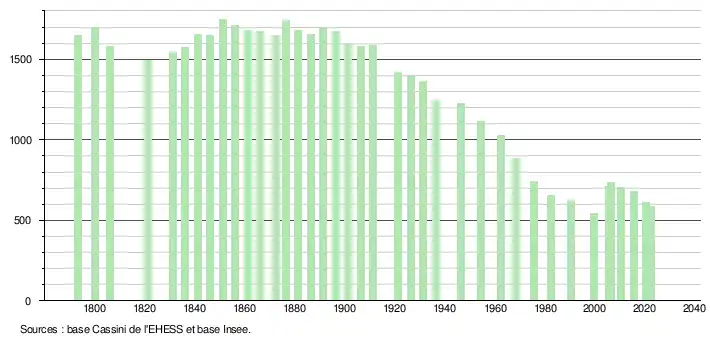 L'évolution du nombre d'habitants est connue à travers les recensements de la population effectués dans la commune depuis 1793. Pour les communes de moins de 10 000 habitants, une enquête de recensement portant sur toute la population est réalisée tous les cinq ans, les populations de référence des années intermédiaires étant quant à elles estimées par interpolation ou extrapolation[14]. Pour la commune, le premier recensement exhaustif entrant dans le cadre du nouveau dispositif a été réalisé en 2005[15].