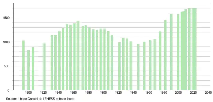 L'évolution du nombre d'habitants est connue à travers les recensements de la population effectués dans la commune depuis 1793. Pour les communes de moins de 10 000 habitants, une enquête de recensement portant sur toute la population est réalisée tous les cinq ans, les populations de référence des années intermédiaires étant quant à elles estimées par interpolation ou extrapolation[14]. Pour la commune, le premier recensement exhaustif entrant dans le cadre du nouveau dispositif a été réalisé en 2004[15].